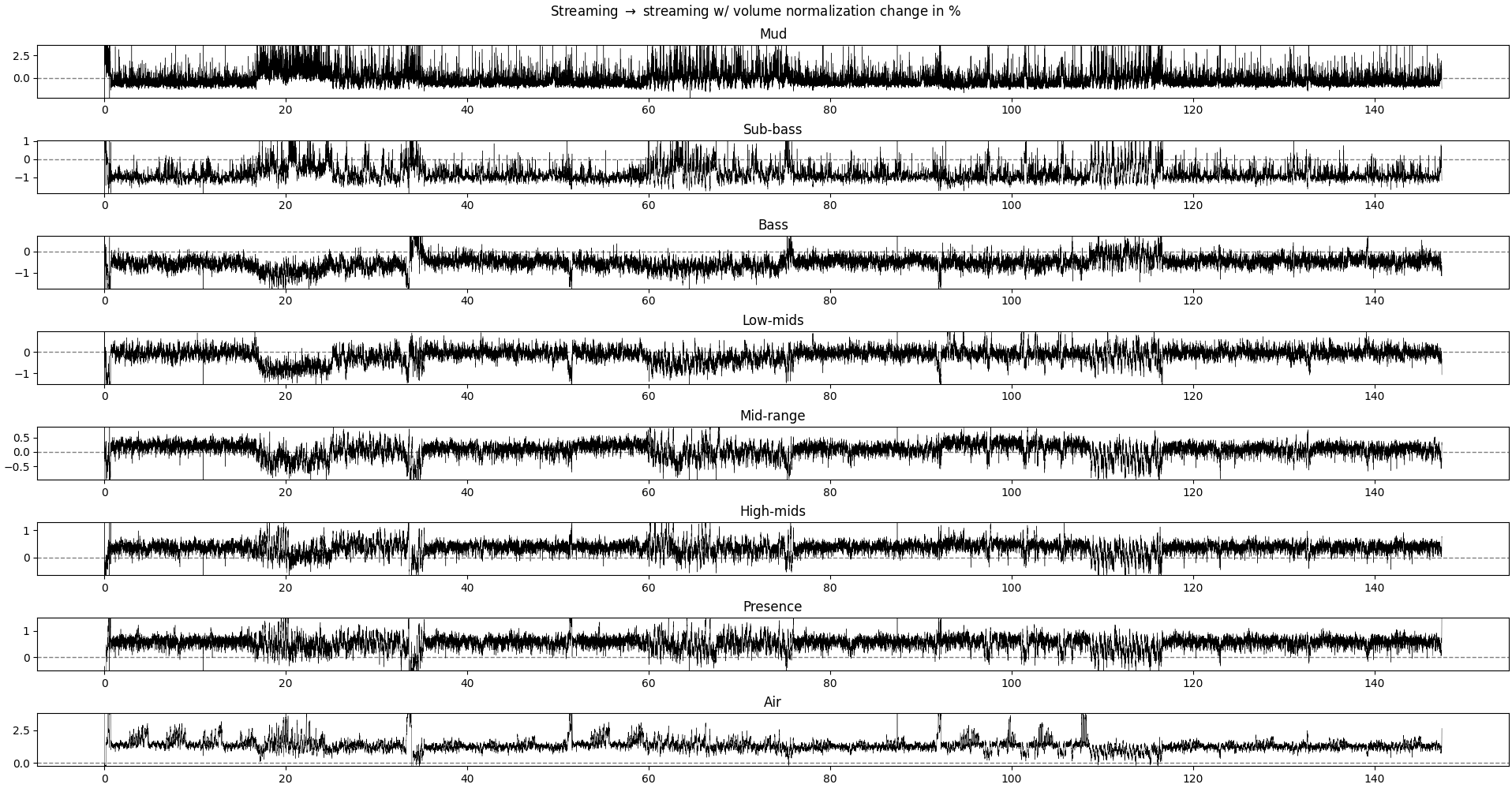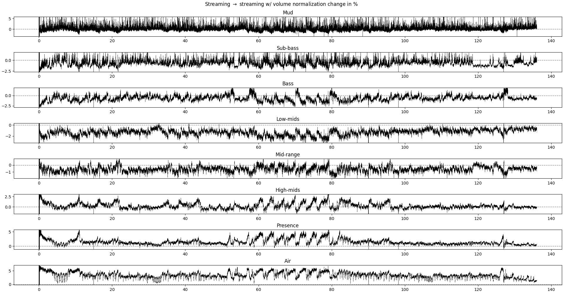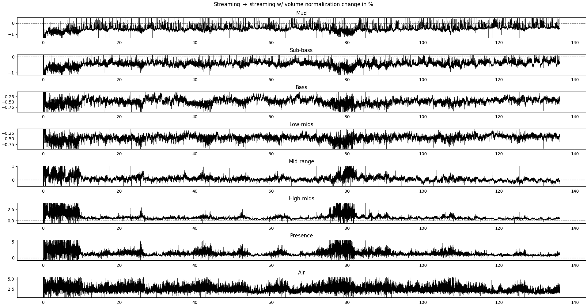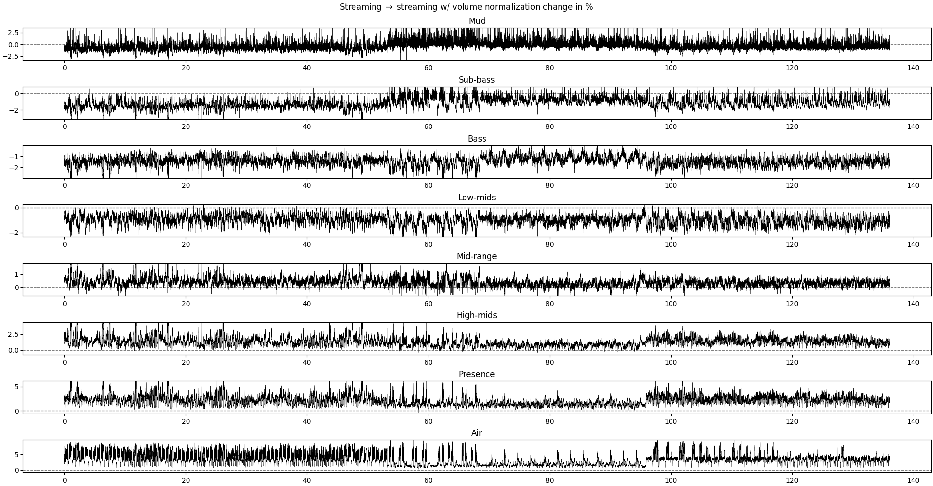 What we could expect if the volume normalization operation is a simple rescaling of the signal, without modulation across time, would be a (near-)1zero difference in all frequency bands, as we are looking at the relative power in each frequency band. The overall power may change, but not its distribution across frequencies.